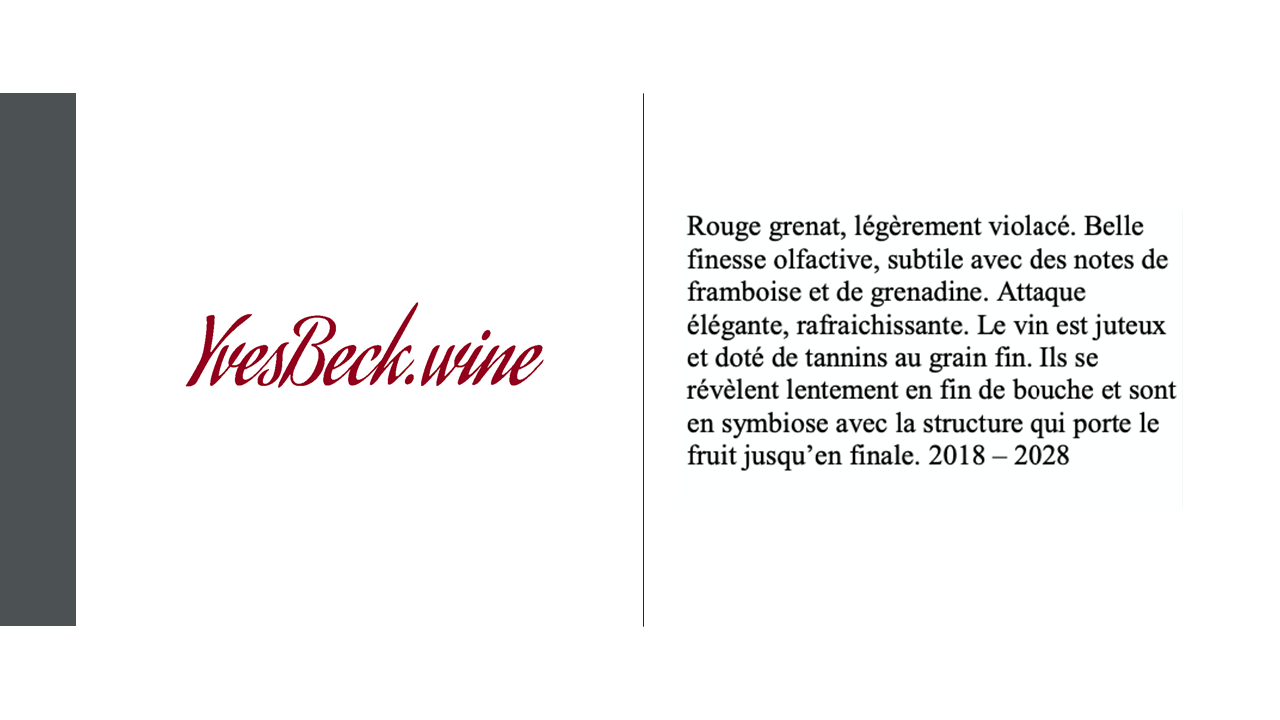 "Le vin est juteux et doté de tannins au grain fin. Ils se révèlent lentement en fin de bouche et sont en symbiose avec la structure qui porte le fruit jusqu'en finale"