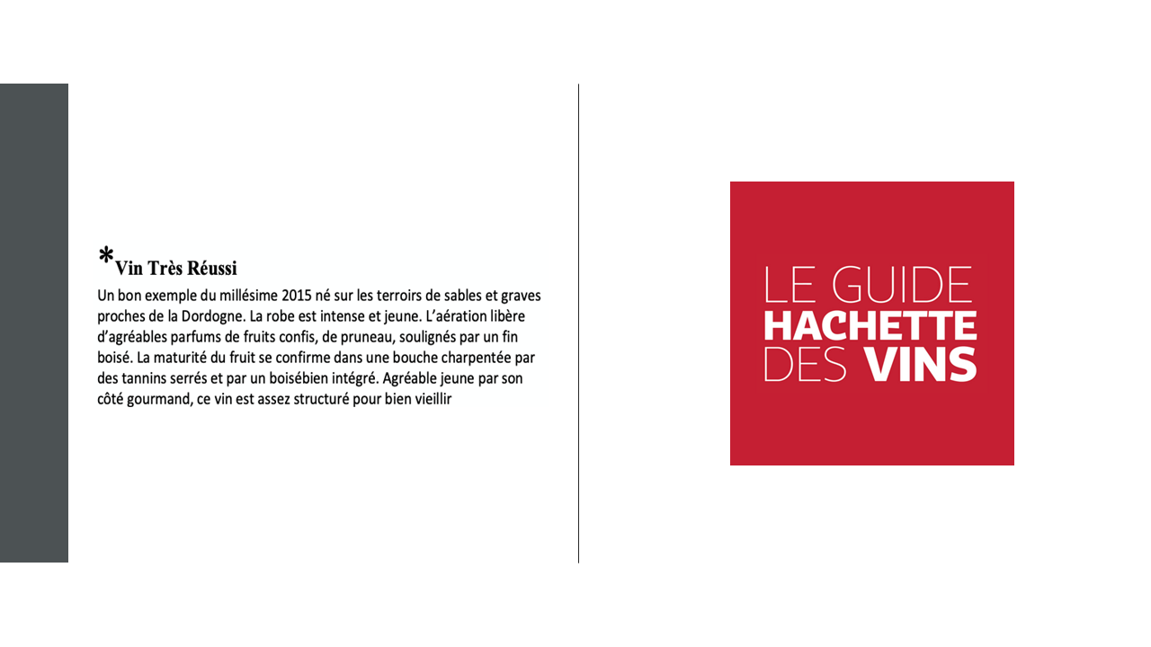 "L'aération libère d'agréables parfums de fruits confis, de pruneau, soulignés par un fin boisé. [...] Agréable jeune par son côté gourmand, ce vin est assez structuré pour bien vieillir."