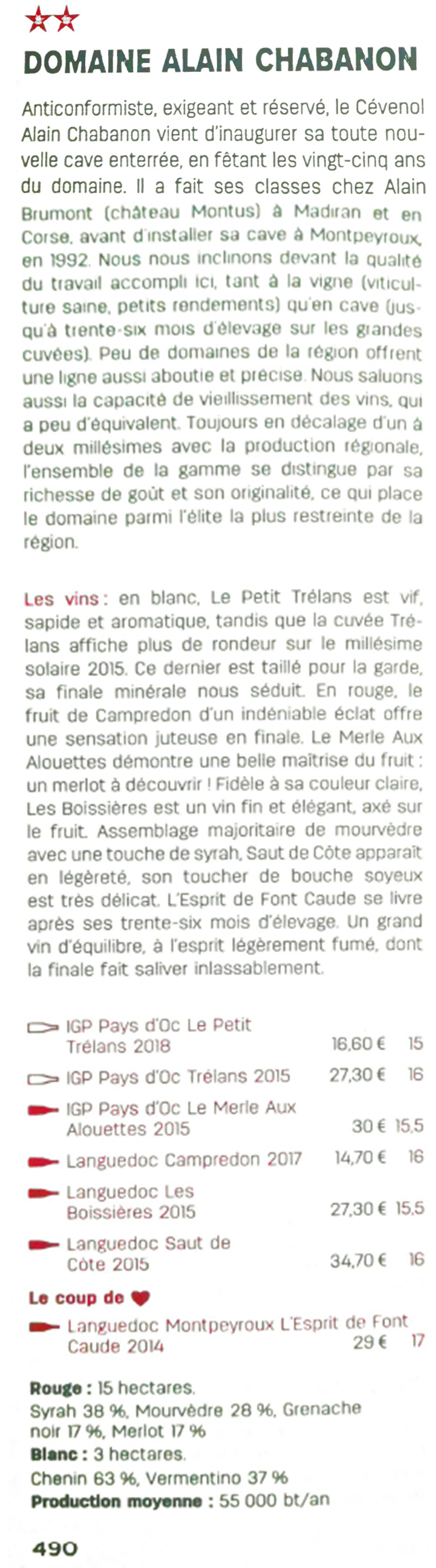 « Le Domaine Alain Chabanon est situé dans l'appellation des Terrasses du Larzac au nord-ouest de Montpellier. L'une des zones les plus fraîches du vignoble languedocien. Le Mourvèdre s'y exprime avec beaucoup d'élégance et donne ici un vin droit, en finesse et en longueur, sur des tanins veloutés, patinés par un élevage soigné et plus de 10 ans de garde. »