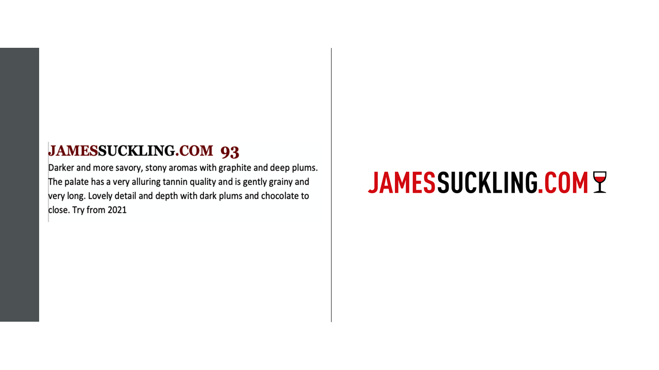 “The palate has a very alluring tannin quality and is gently grainy and very long. Lovely detail and depth with dark plums and chocolate to close.”