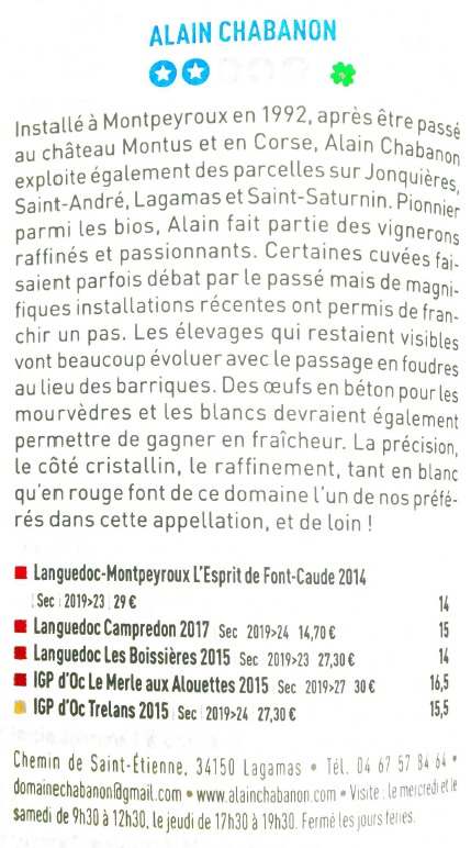 « Le Domaine Alain Chabanon est situé dans l'appellation des Terrasses du Larzac au nord-ouest de Montpellier. L'une des zones les plus fraîches du vignoble languedocien. Le Mourvèdre s'y exprime avec beaucoup d'élégance et donne ici un vin droit, en finesse et en longueur, sur des tanins veloutés, patinés par un élevage soigné et plus de 10 ans de garde. »